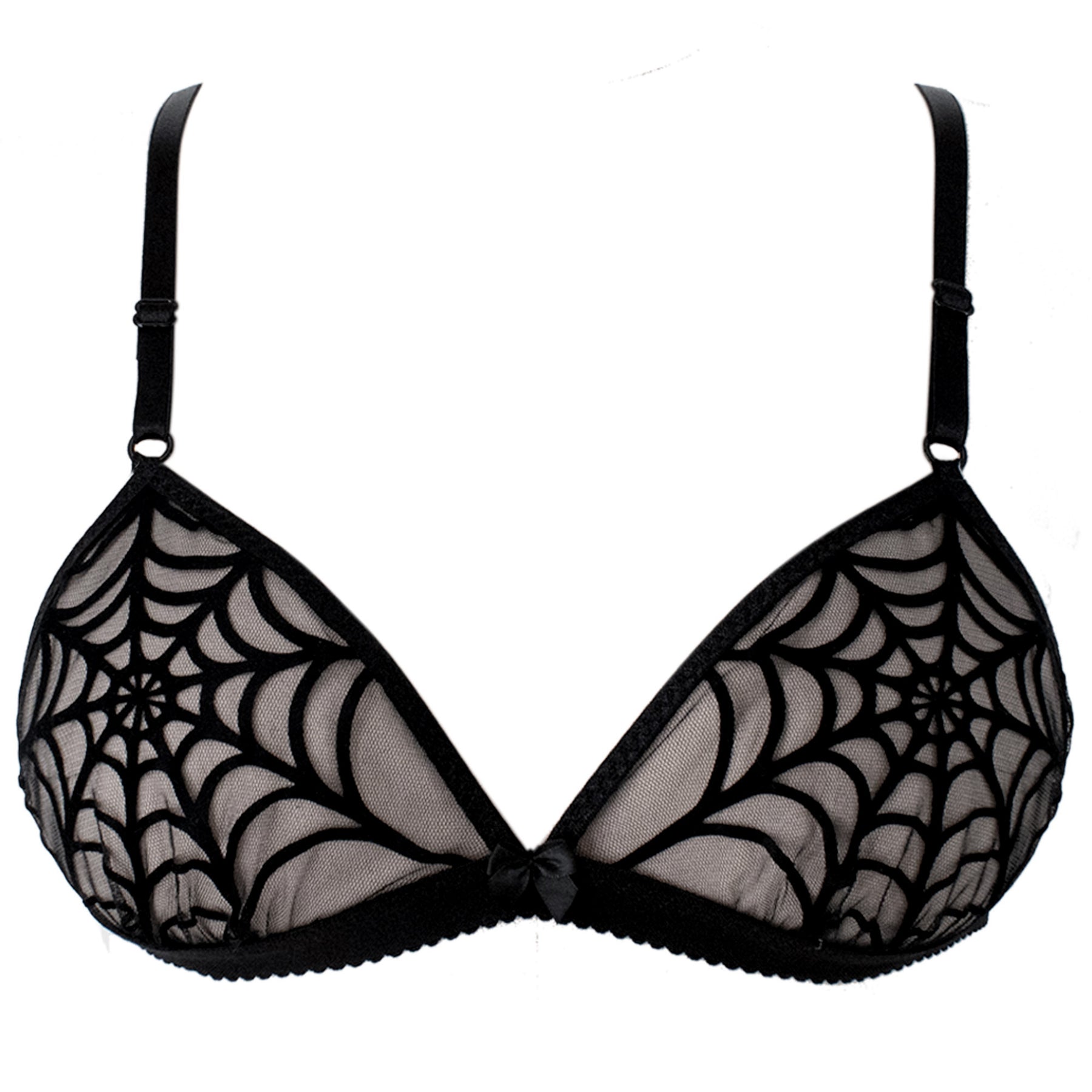 Black sheer mesh spiderweb bralette has a laser cut and hand applied black velvet spiderweb appliqué. The fabric is a non-stretch mesh that is so delicate and soft, yet supportive at the same time. Bra is finished with black fold over elastic and adjustable straps, which conveniently adjust in front. The band is a soft, double plush picot edge elastic that measures 5/8” thick and is adjustable. This is a great width to be supportive, feminine and delicate.