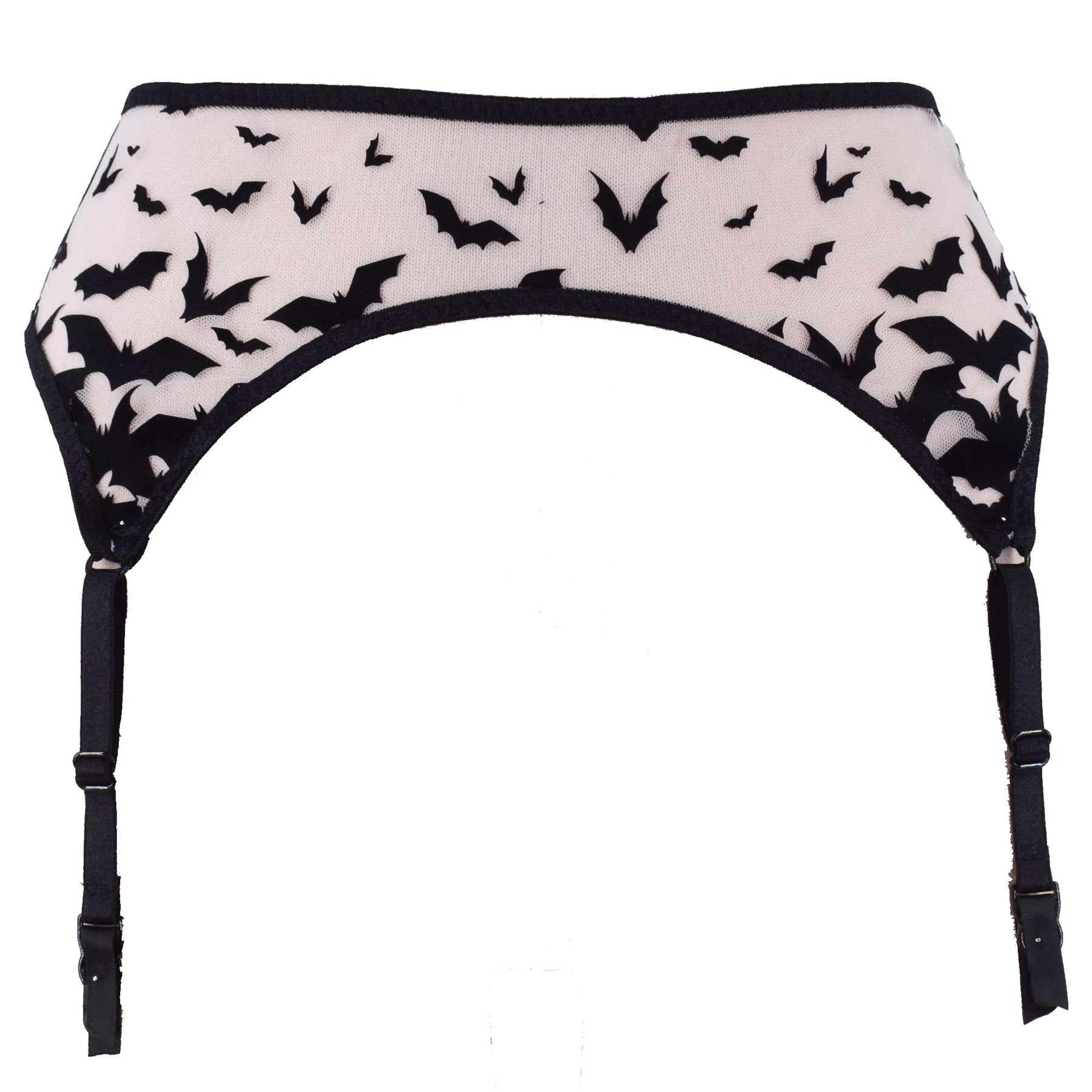 Garter belt is made out of hand dyed sheer mesh in a light nude shade.    The front is adorned with black velvet bats appliqué and the back is black stretch mesh.  Garter belt is trimmed with black fold over elastic and features a delicate lingerie zig zag stitch, which is known for its added durability and stretch.  Garter belt has four adjustable straps each trimmed with satin ribbon.