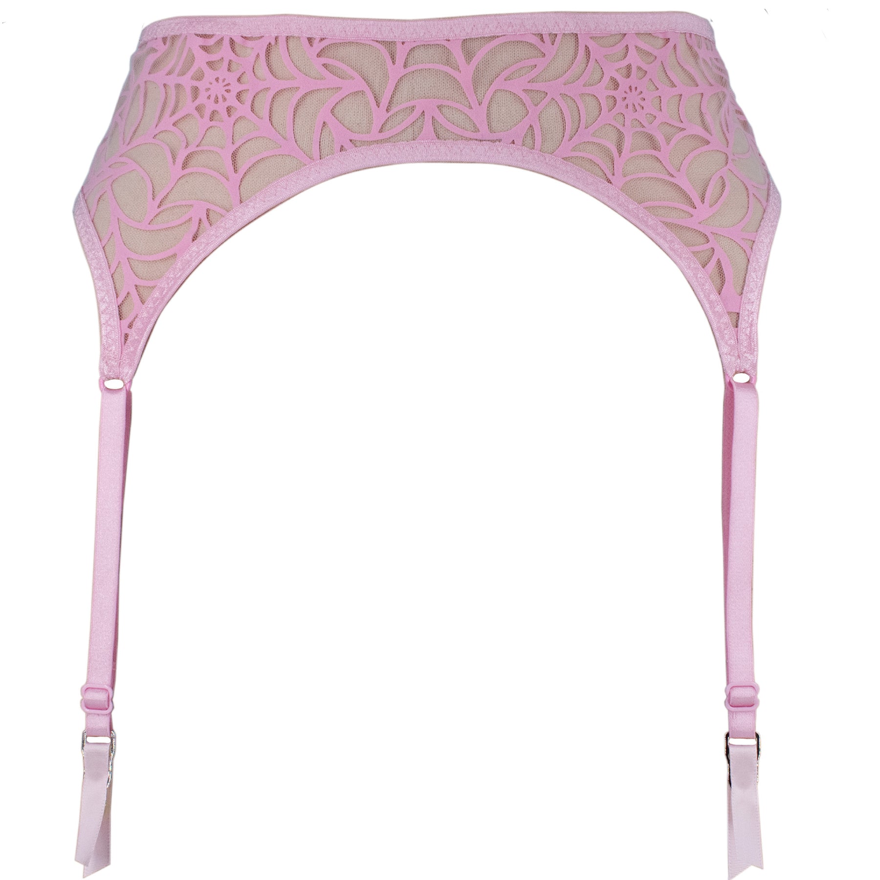 Garter belt is made out of the sheer tulle adorned with a soft pink velvet spiderweb appliqué. The back is a stretch mesh in a matching baby pink shade and closes with a pink s-hook. Garter belt is trimmed with pink fold over elastic and features a delicate lingerie zig zag stitch, which is known for its added durability. Garter belt has four adjustable straps, luxury gold metal garter hooks, trimmed with a matching satin ribbon.