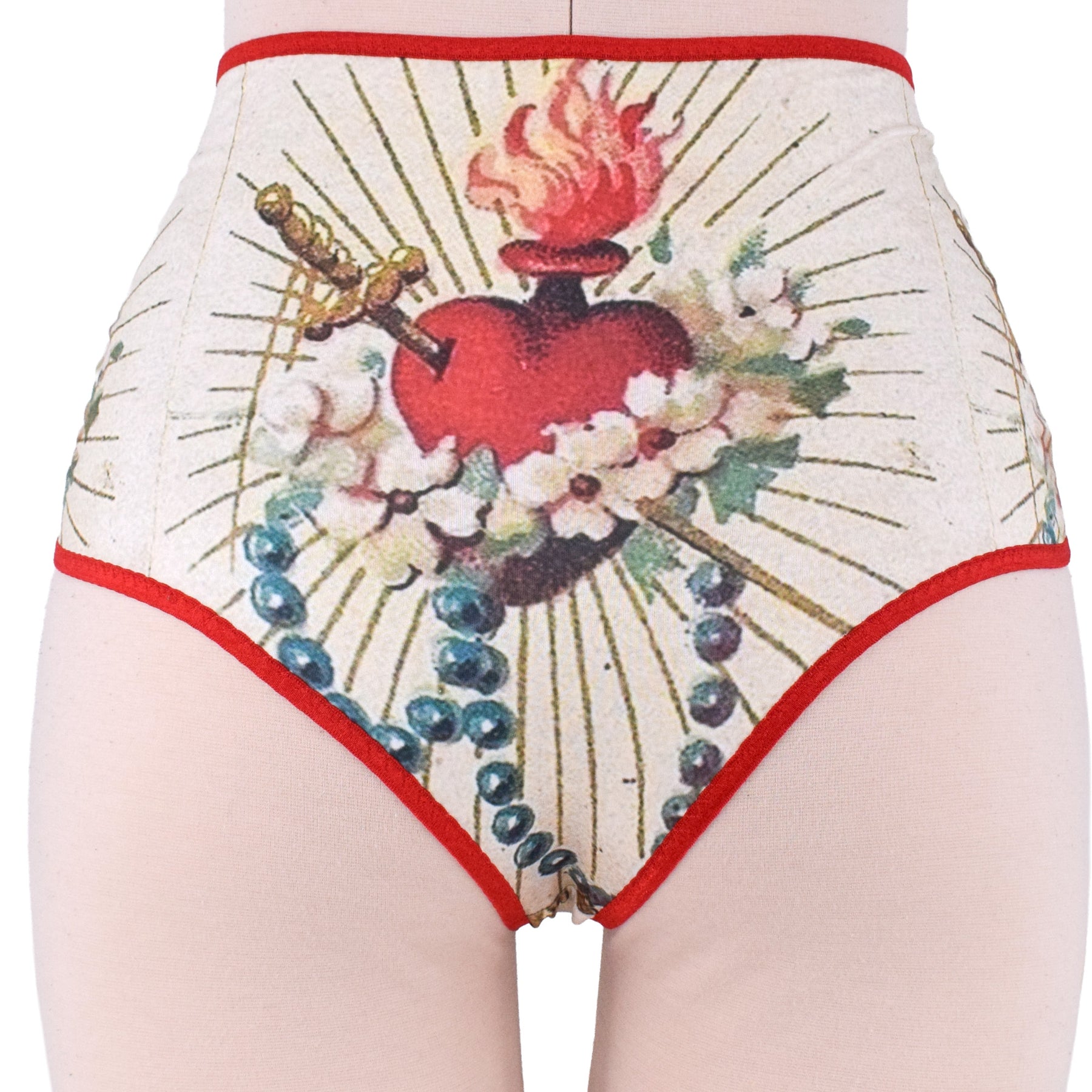 Sacred heart high waist panty set is hand printed using sublimation on a buttery soft polyester/spandex. Bralette and high waist panty are finished with a red fold over elastic and red bow. Panty has a cotton gusset.