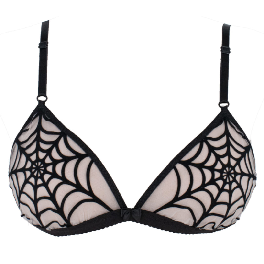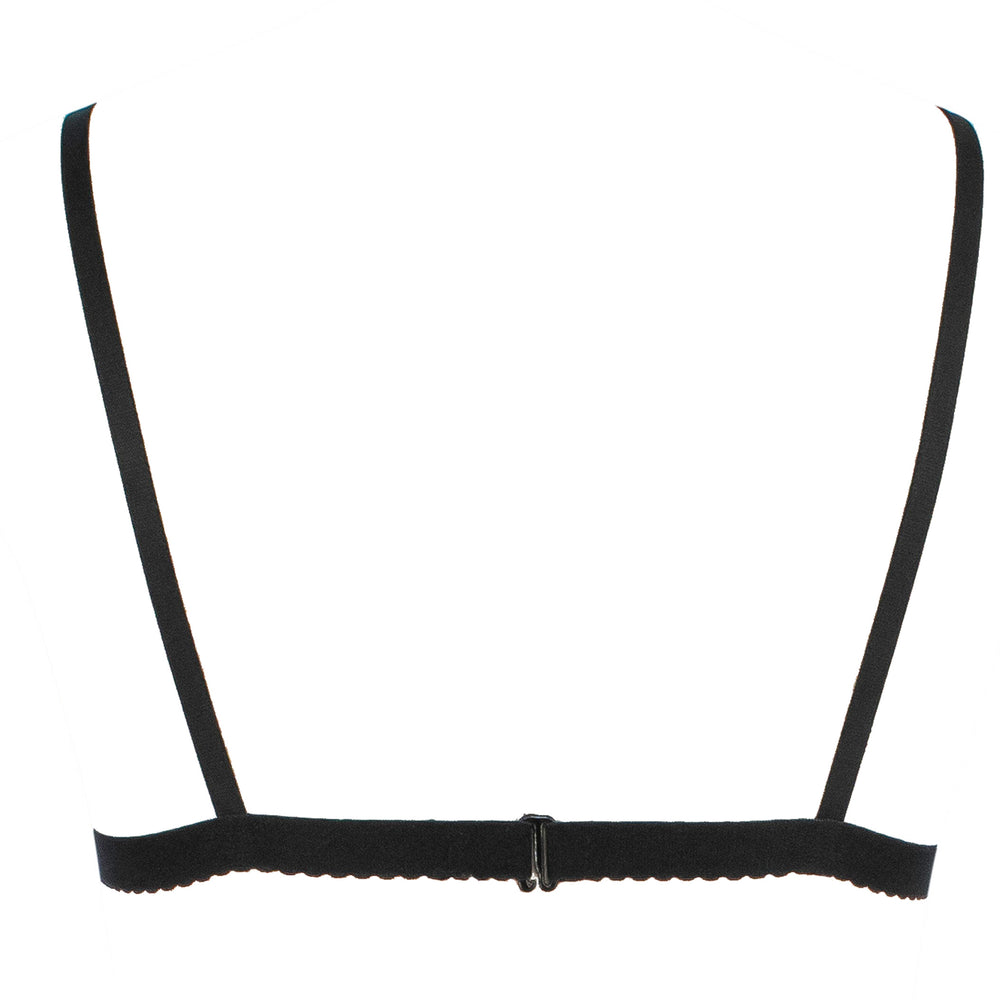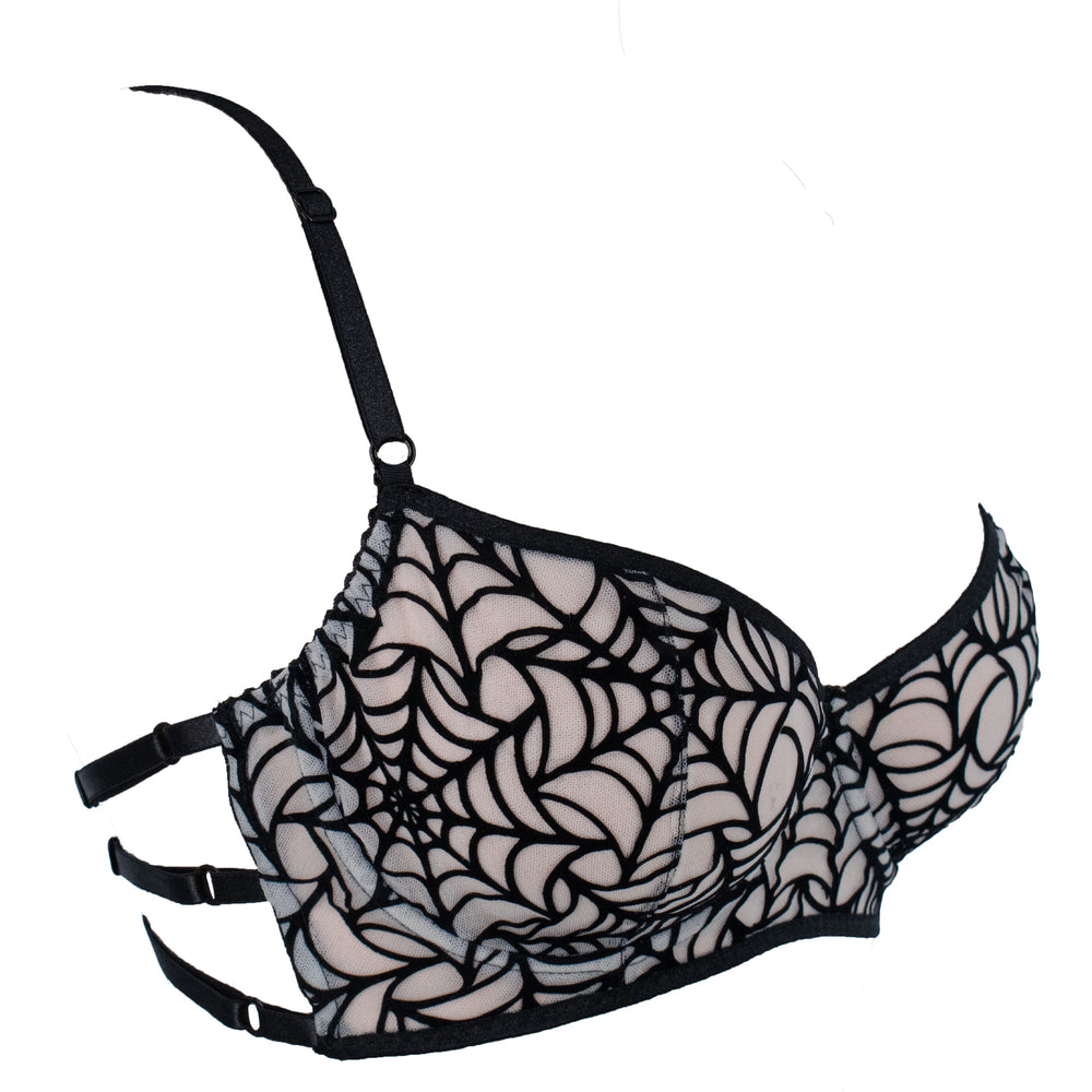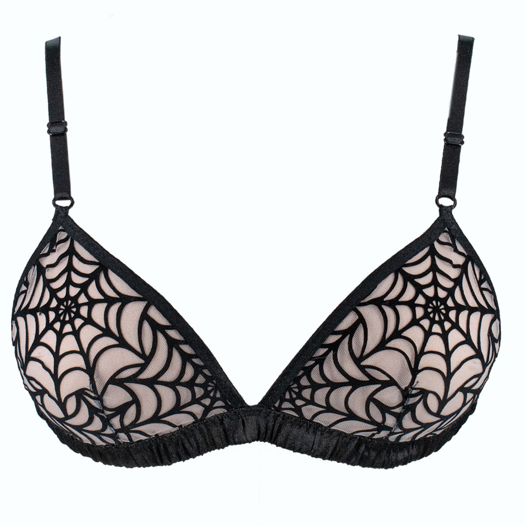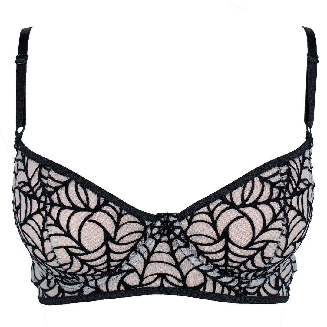 Peachy pink sheer mesh bralette with black velvet bow appliqué