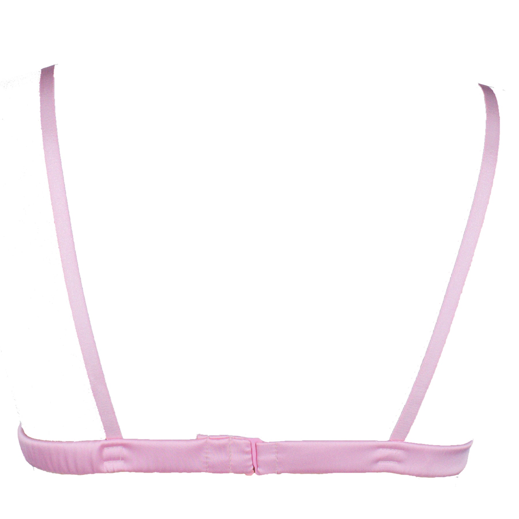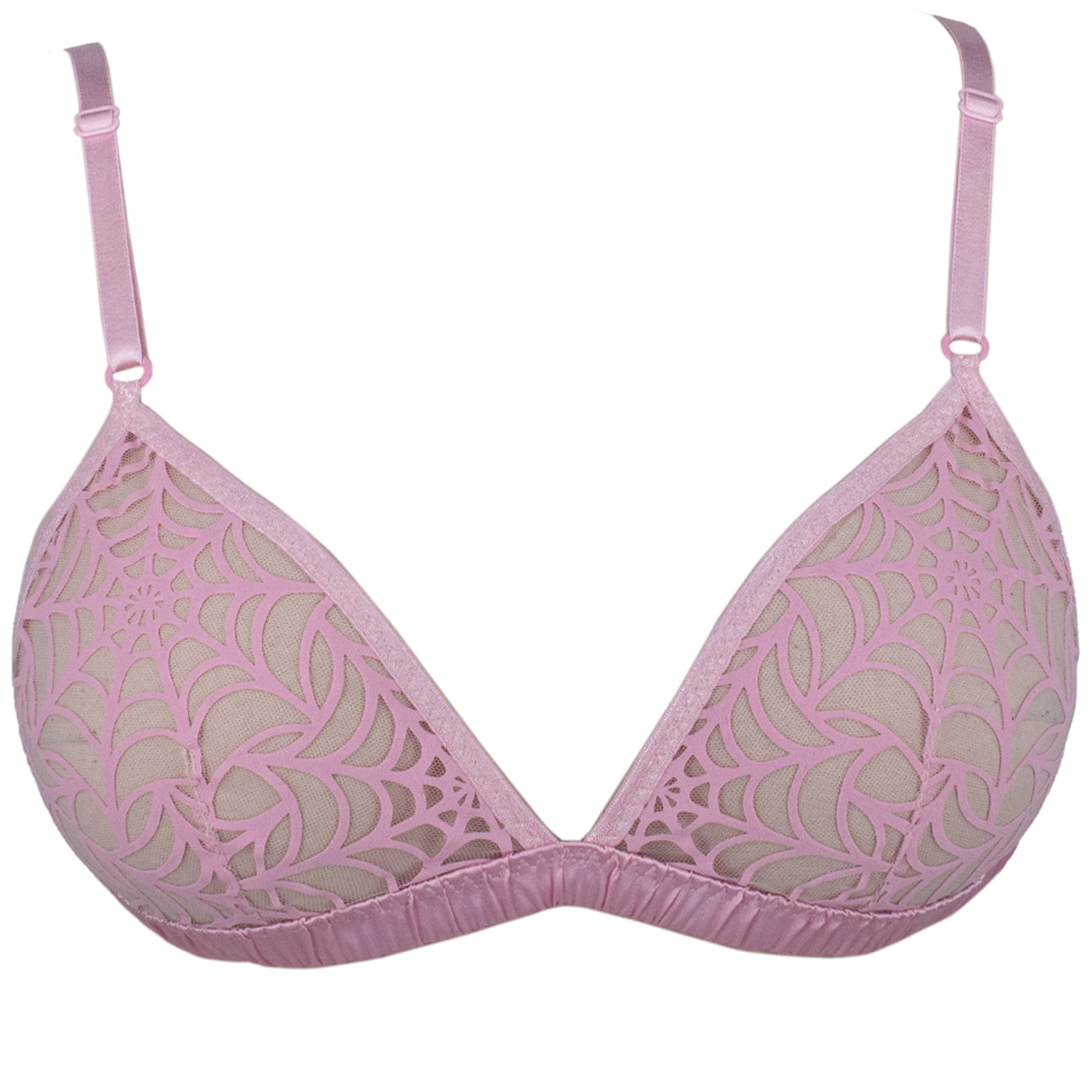 New for 2025!  The bestselling spiderweb bralette has been reimagined and updated with an intricate spiderweb pattern and a ruched satin band.  Nude sheer tulle has a laser cut  pink velvet spiderweb appliqué.  The elastic band is covered in soft pink satin, creating a gorgeous ruched effect and is so soft on the skin.  Bra is finished with pink fold over elastic and adjustable straps, which conveniently adjust in front.
