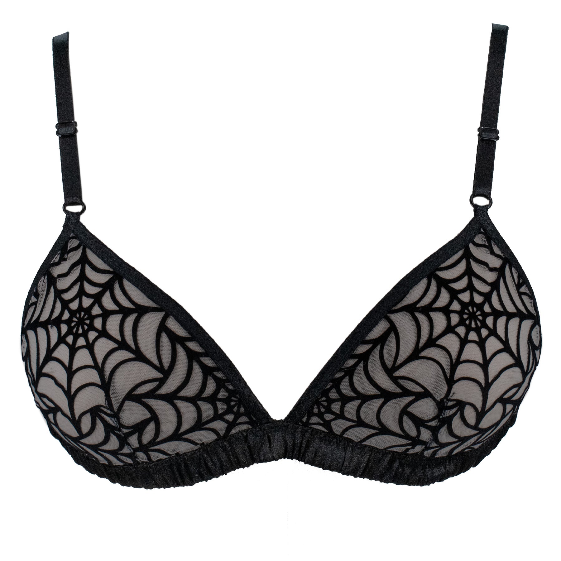 New for 2025! The bestselling spiderweb bralette has been reimagined and updated with an intricate spiderweb pattern and a ruched satin band. Almost invisible light flesh tone tulle has a laser cut black velvet spiderweb appliqué. The sheer tulle fabric has been hand dyed. The elastic band is covered in soft black satin, creating a gorgeous ruched effect and is so soft on the skin. Bra is finished with black fold over elastic and adjustable straps, which conveniently adjust in front.