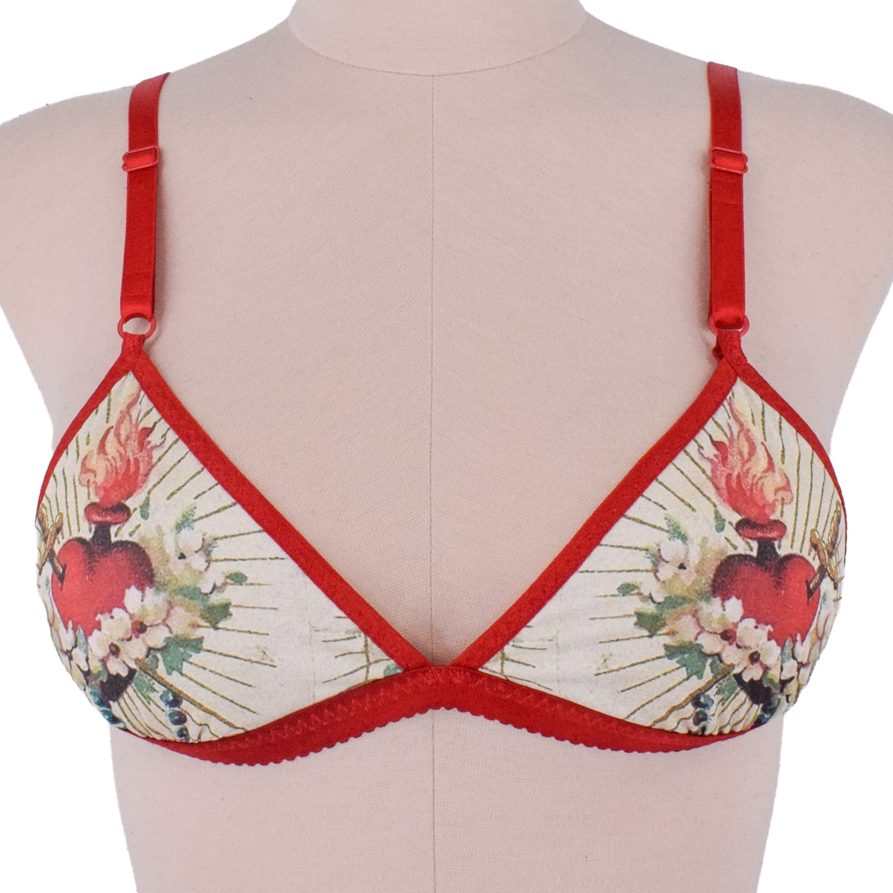 Sacred heart bralette and high waist panty set is hand printed using sublimation on a buttery soft polyester/spandex. Bralette and high waist panty are finished with a red fold over elastic and red bow. The bralette has a mesh lining for support and has a 5/8" scalloped plush elastic band that closes in back with a swan hook. Bralette has adjustable pause elastic straps that adjust in front. Panty has a cotton gusset.