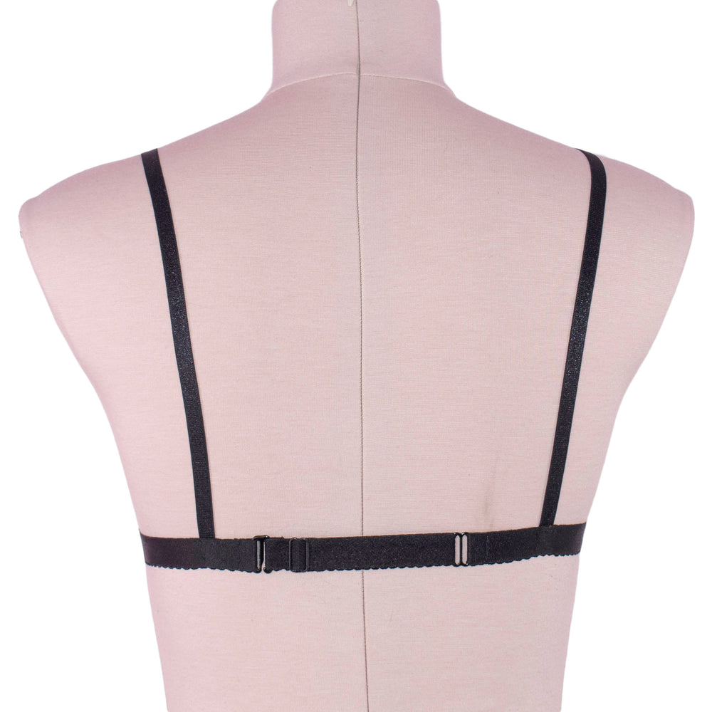Sandy beige, flesh tone sheer mesh spiderweb bralette, has a laser cut and hand applied black velvet spiderweb appliqué. The sheer mesh fabric has been hand dyed in a sandy beige shade. Bra is finished with black fold over elastic and adjustable straps, which conveniently adjust in front. The band is a soft, double plush picot edge elastic that measures 5/8” thick and is adjustable/ This is a great width to be supportive, feminine and delicate.