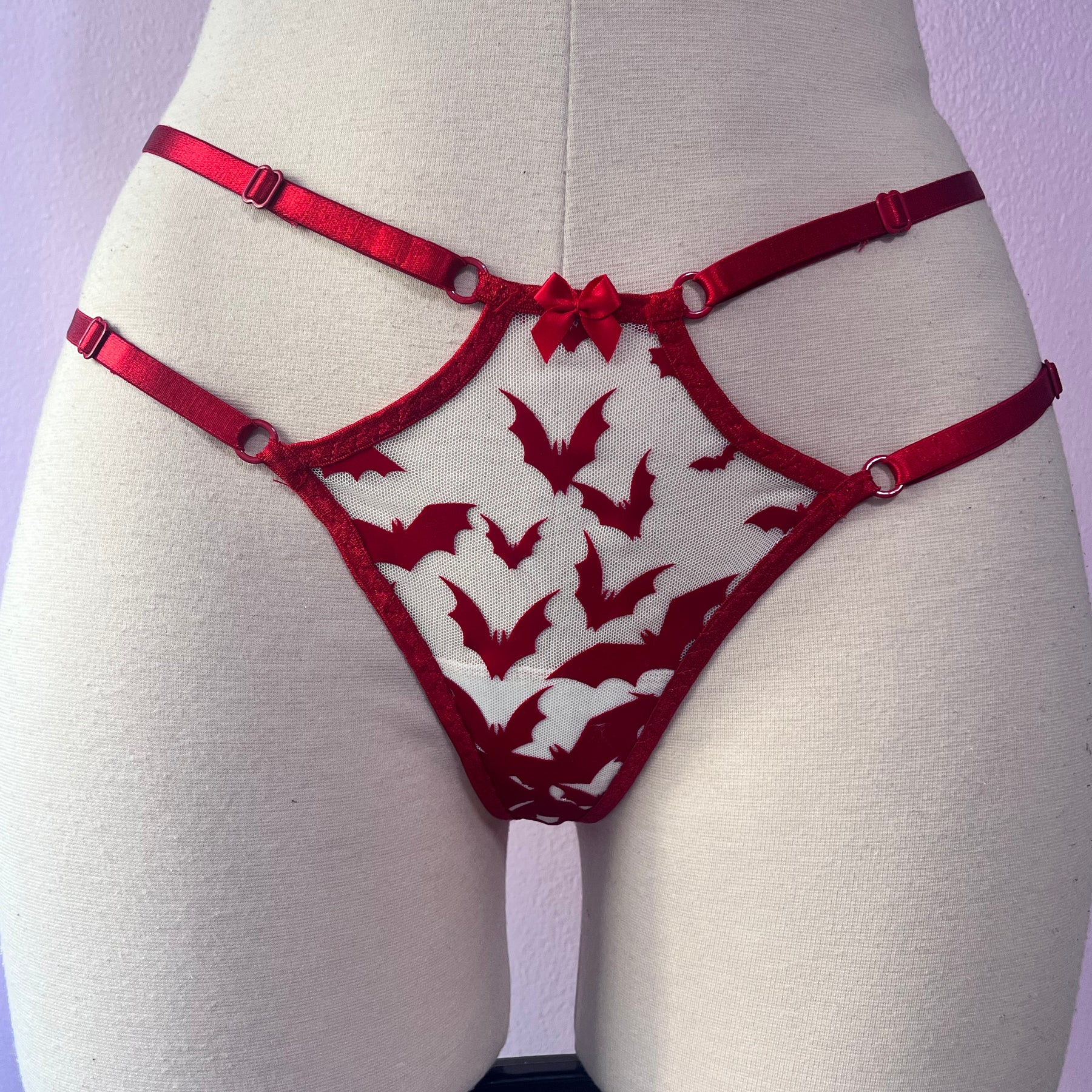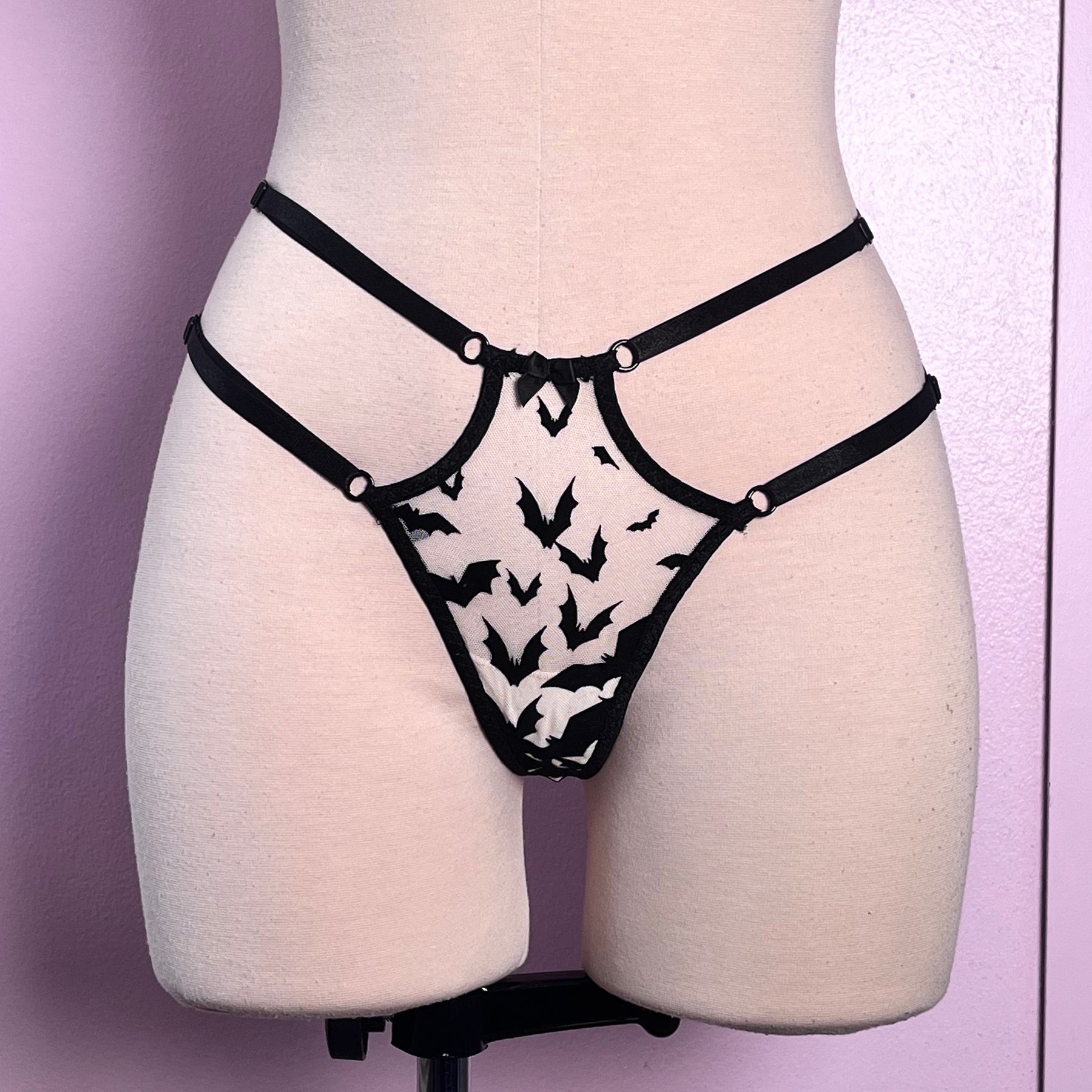 Bring out your inner showgirl in this spiderweb thong is made out of the softest, hand dyed mesh, in the most delicate sandy flesh tone shade. Thong has a hand applied black velvet bat appliqué and adjustable straps on side to accentuate your figure. Thong is finished with black fold over elastic and features a delicate lingerie zig zag stitch, which is known for its added durability. Trimmed with a black satin bow on front
