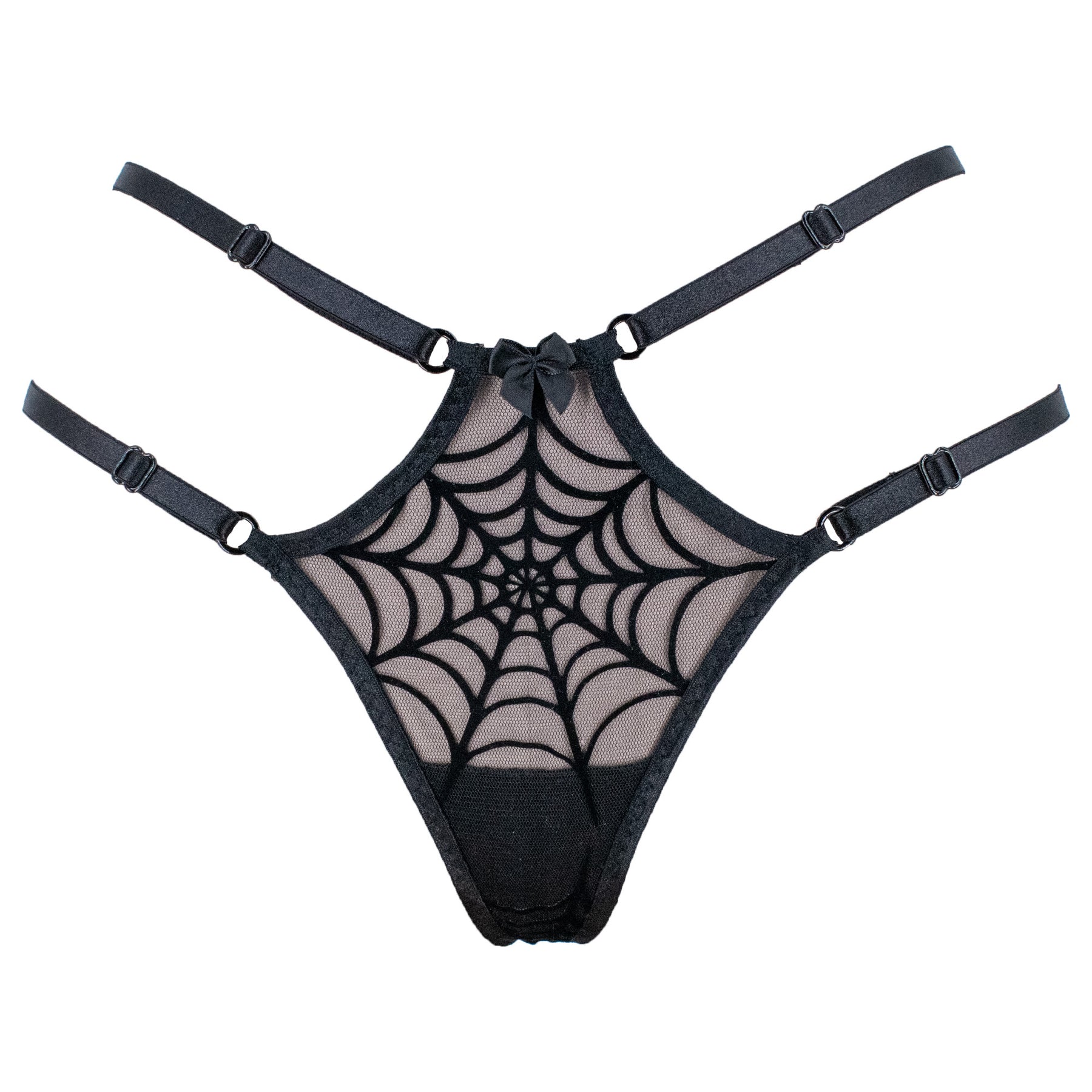 Bring out your inner showgirl in this spiderweb thong is made out of the softest, stretch black mesh. Thong has a laser cut and hand applied black velvet spiderweb appliqué with adjustable straps on side to accentuate your figure. Thong is finished with black fold over elastic and features a delicate lingerie zig zag stitch, which is known for its added durability. Trimmed with a black satin bow on front.