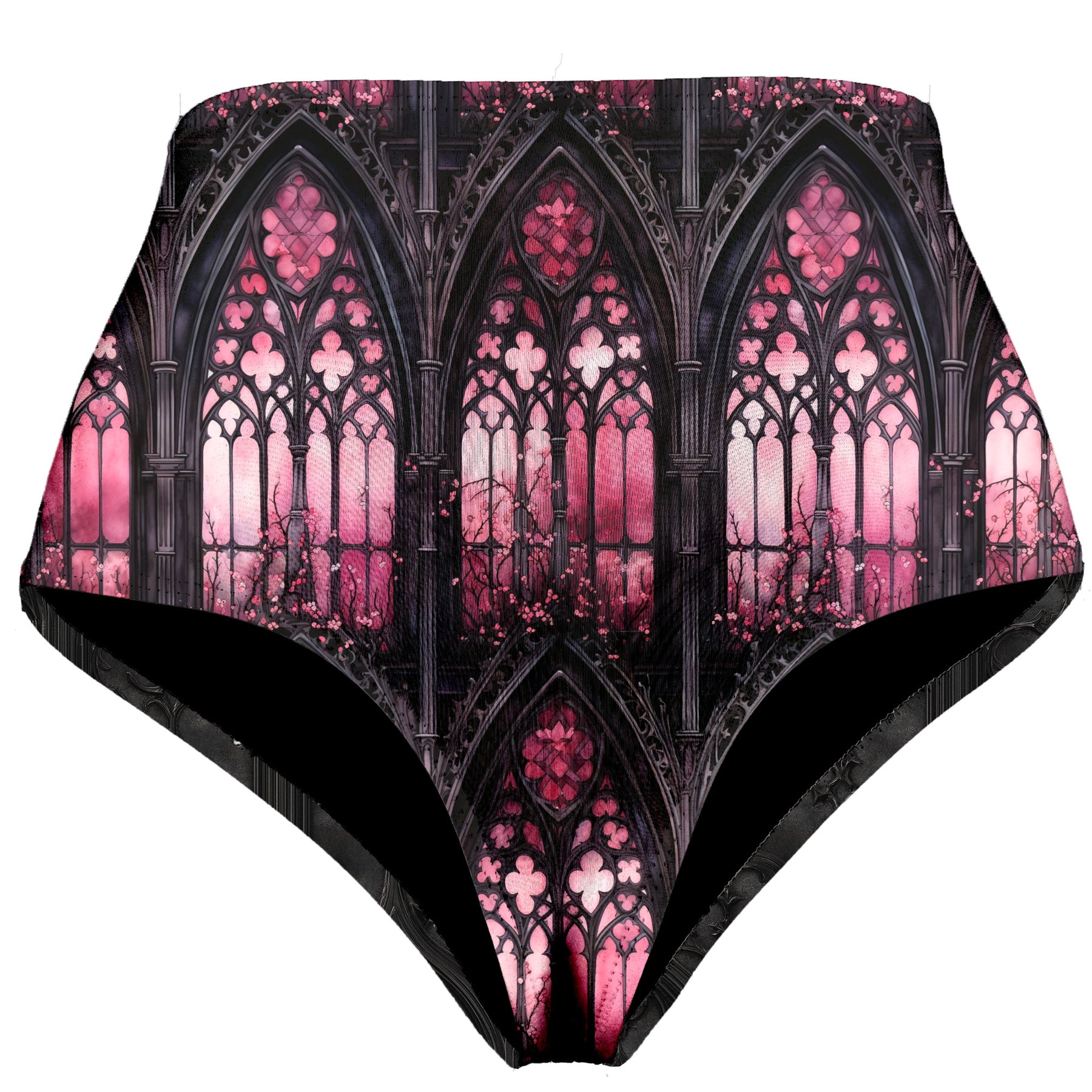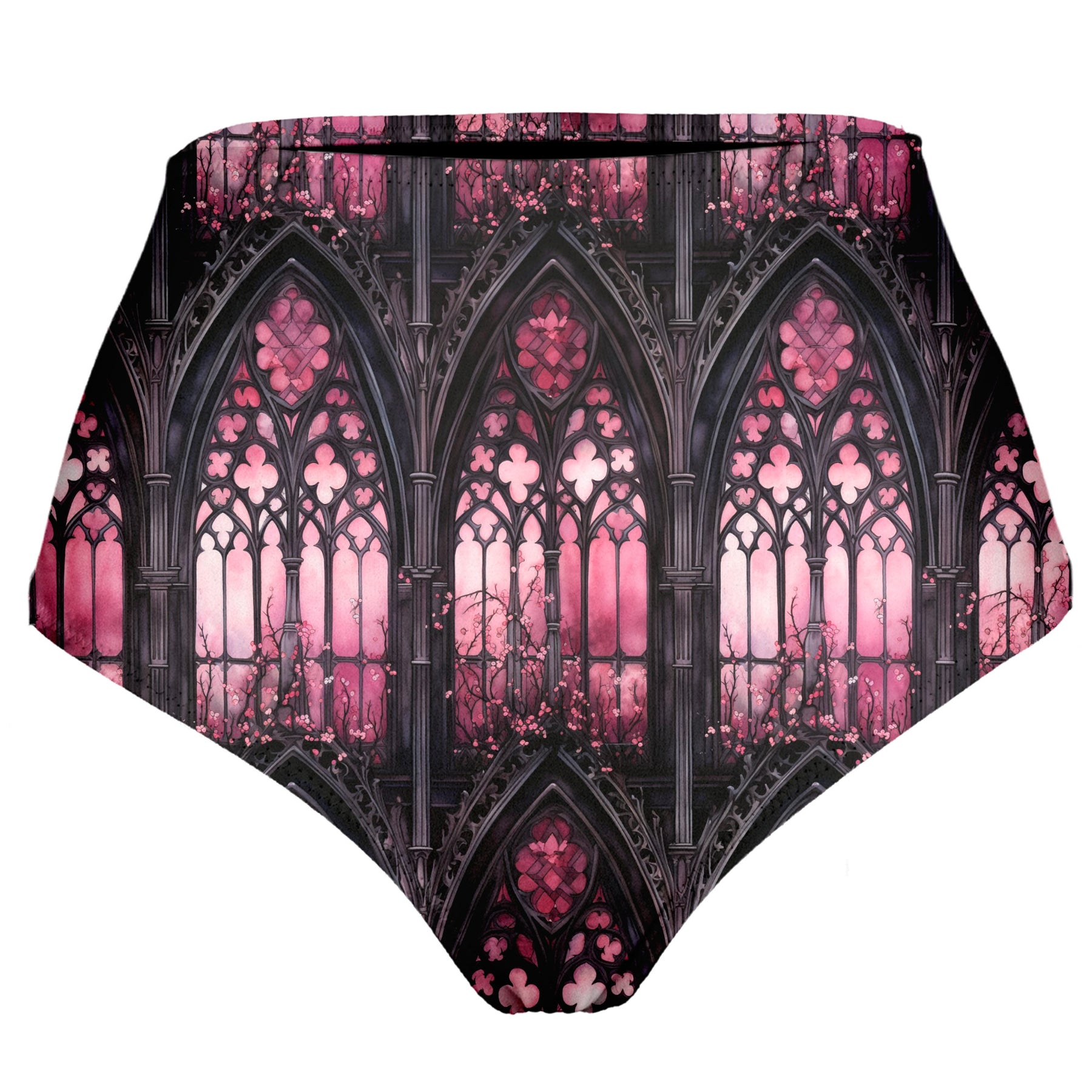 High waist bikini bottom is made out of a gothic black cathedral print. High waist bottom has a cute cheeky cut that is flattering and elongates the leg. Swimsuit is fully lined with a soft stretch black jersey, finished with rubber elastic and topstitched for a professional finish.