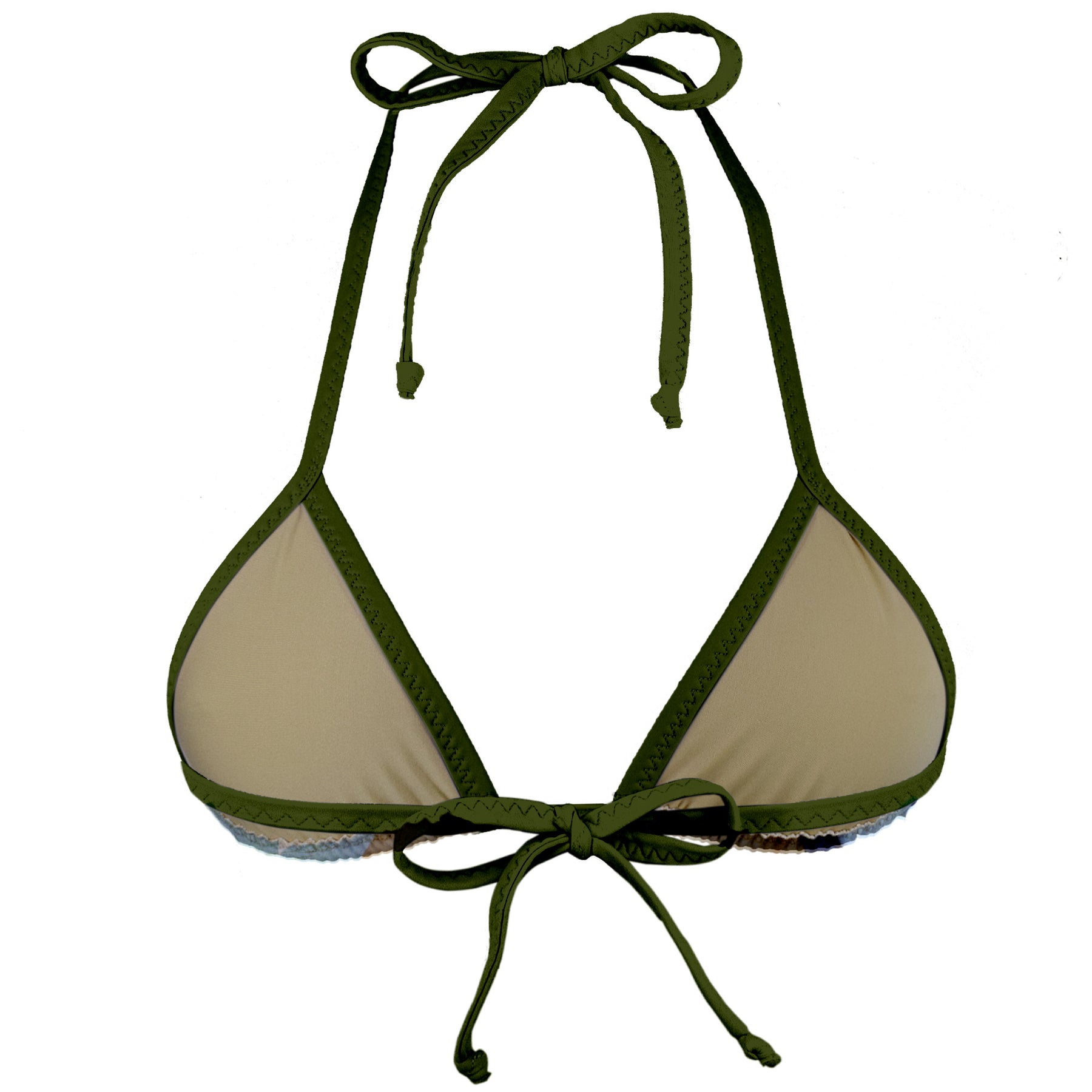 The Birth of Venus by Sandro Botticell triangle string triangle top is the most comfortable swimsuit to wear! Bikini top is made from the softest knit jersey swimwear fabric. Top is trimmed with dark green binding that encases the front and back. Ties around the neck and back with soft-stretchy ties. Bikini is fully lined and has no padding